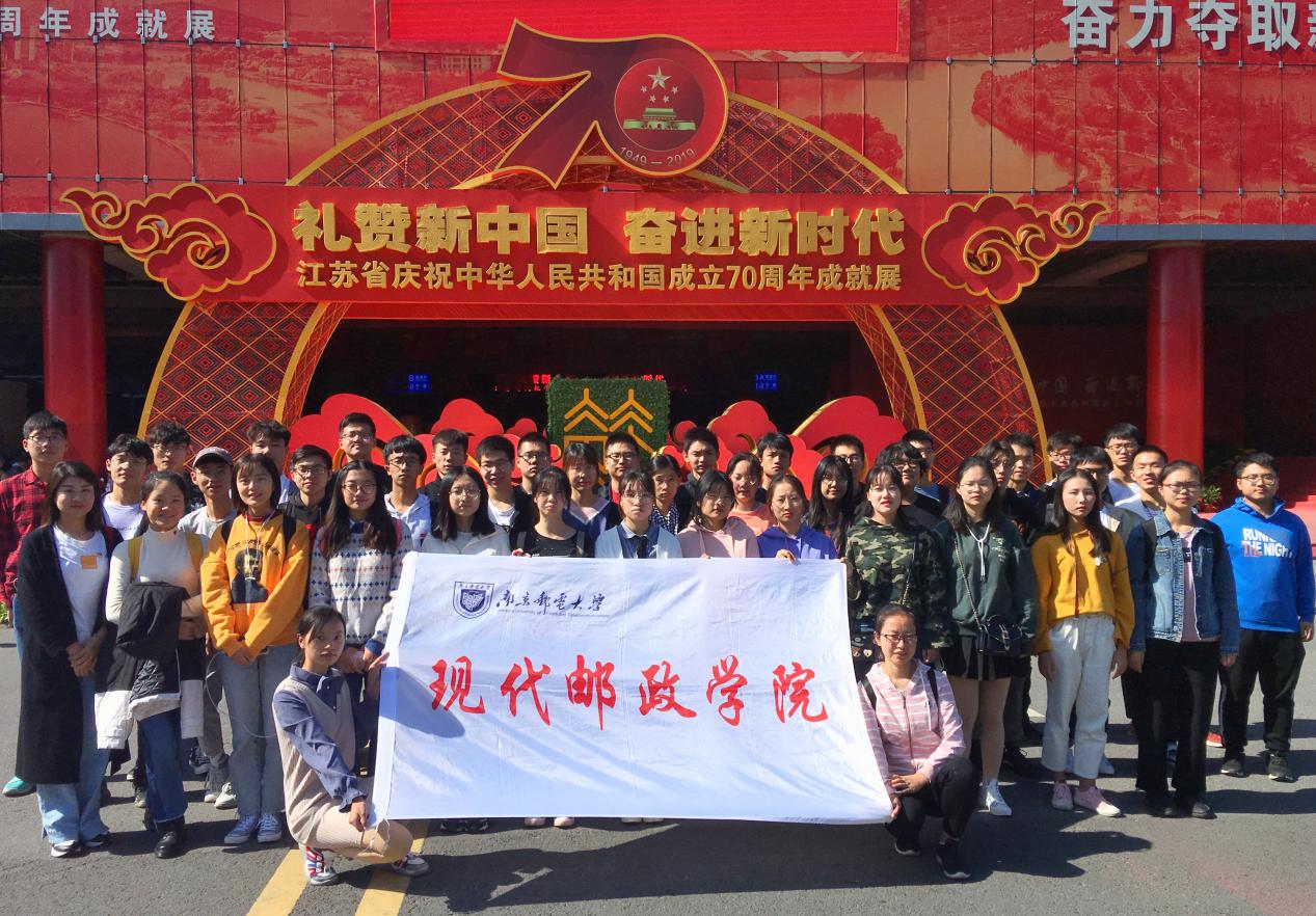 本次主题成就展通过典型图片、实物模型、场景还原、动态演示、互动体验等多种方式,生动展示了在党中央的正确领导下,新中国成立70年来江苏建设、改革、发展的伟大历程。参观展览的同学们被江苏在科技、教育、工业、农业、医疗、城市建设等各方面获得的巨大成就所震憾。做为邮政、物流业的储备军,大家在看到观展室内陈列的苏宁5G“卧龙”无人车和京东配送机器人3代十分欣喜,大家感受到智慧物流的迅猛发展,也切实体会到计算机、人工智能的研究为如今人民生活提供的诸多便利。