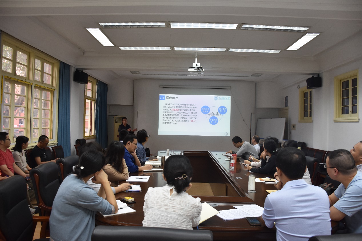 为深入贯彻落实习近平新时代中国特色社会主义思想和党的十九大精神,持续贯彻落实全国高校思想政治工作会议精神,进一步推进我们“课程思政”育人工作,9月23日,我们在三牌楼校区行政北楼二楼会议室举办了课程思政专题讲座和研讨会,会议特别邀请了计算机学院院长助理胡素君老师,研讨会由我们教学副院长曹亚东老师主持。